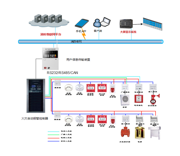 用户信息传输装置集报警上传、设备自检、复位等功能于一身,是一款安装方便、使用简单的设备。传输装置可通过CAN总线、485总线或232线连接火灾自动报警系统,并通过有线或无线网络连接监控中心平台。在险情或异常发生时,传输装置可实时将各类消防控制器的报警信息、运行情况或故障上传至监控中心,实现消控室连接云端远程在线监控。